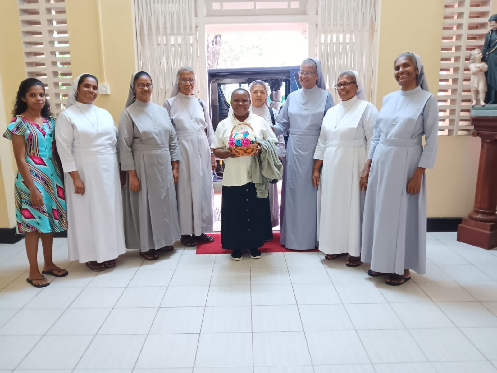 Arrivée à la maison provinciale, toutes les sœurs m’attendaient. La Provinciale m’a remis un panier de fleurs, puis elles m’ont invitée à entrer seule à la chapelle. Après un rafraichissement, nous sommes allées à table pour grignoter quelque chose.